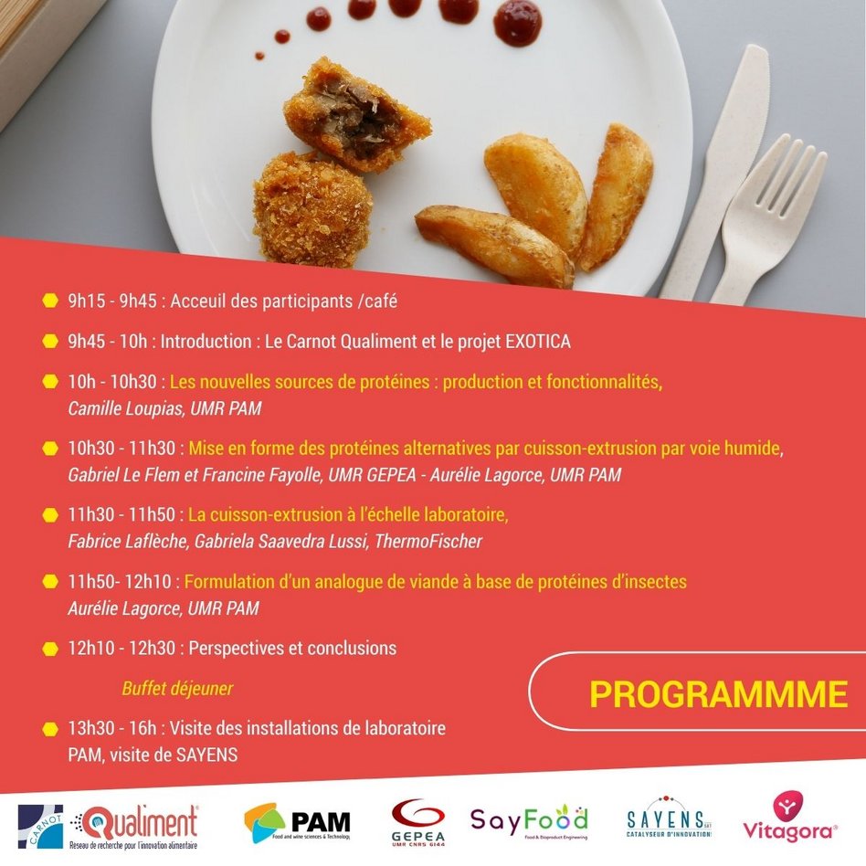 A l’occasion de la fin du projet, une journée technique aura lieu à l'UMR PAM le 15 juin à Dijon autour des nouvelles sources de protéines et de leur mise en forme par cuisson-extrusion en voie humide.